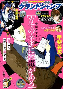 グランドジャンプ No.21 大好評発売中!表紙&巻頭カラー「カモのネギには毒がある 加茂教授の人間経済学講義」 巻中カラー「ハボウの轍〜公安調査庁調査官・土師空也〜」 巻中カラー「怨み屋本舗DIABLO」